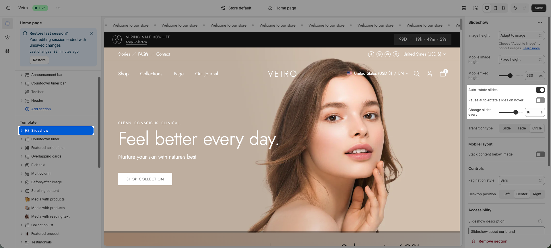 Auto-rotate allows your slides to run automatically. You can configure how many seconds it takes before the slider moves to the next slide.