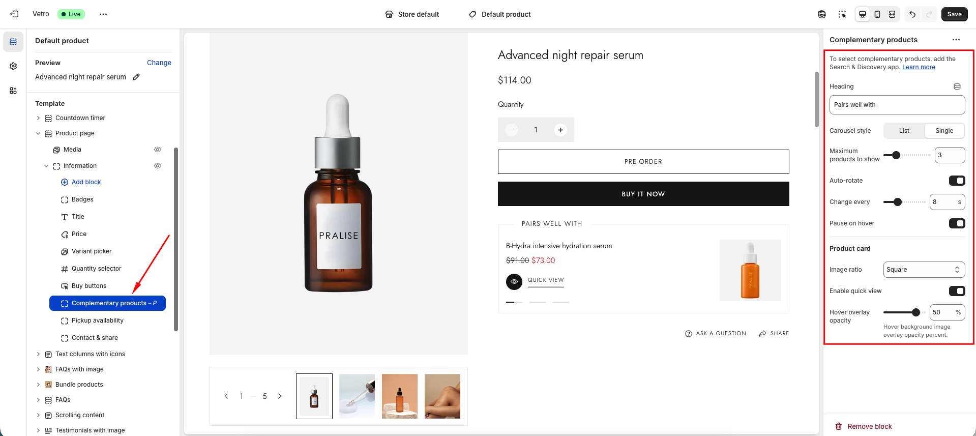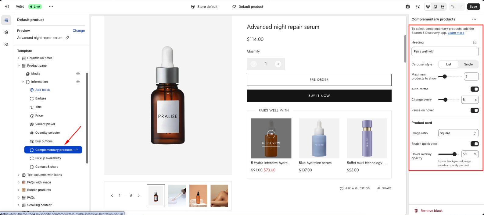 Select the main product, add the complementary products you’d like to show, then Save.