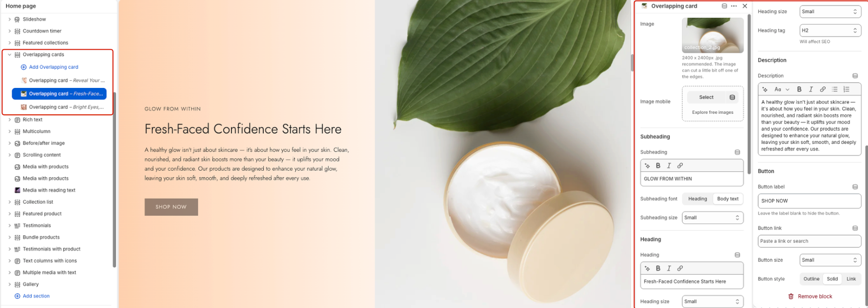 Overlapping Cards is a section that displays content with layered images and text.