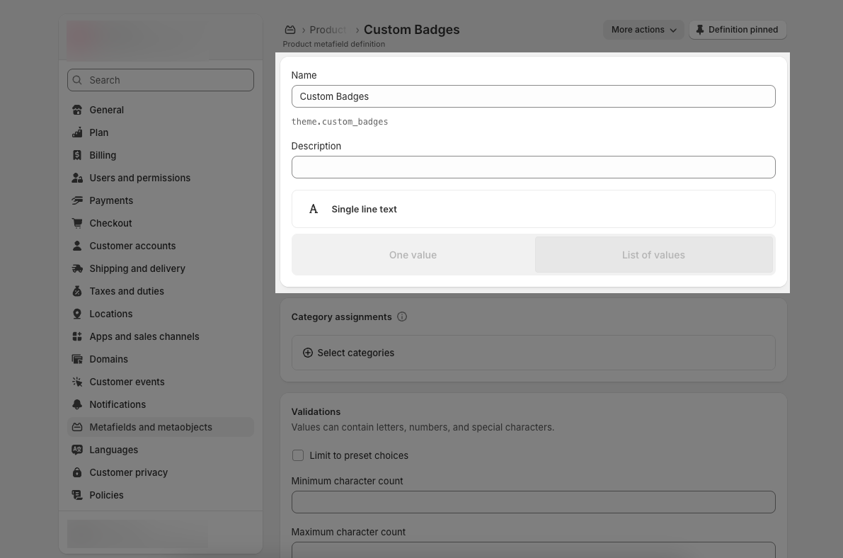 Step 2: Enter name & Namespace and key > Select Content Type: Text > Single line text > List of values (you can add up to 5 badges for one product)