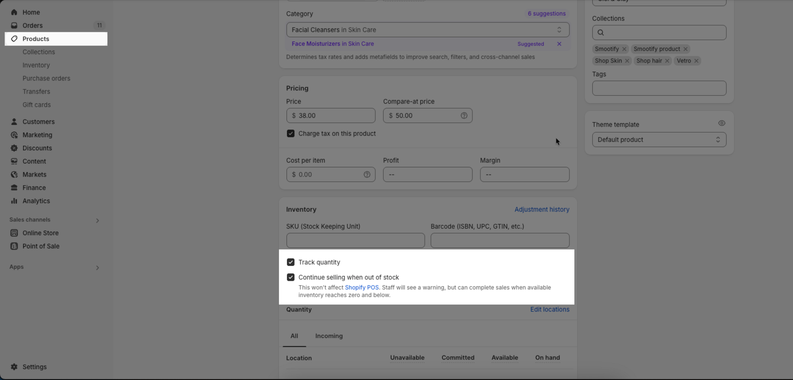 To set up pre-order products, you tick on 'Track quantity' and 'Continue selling when out of stock' of the product.