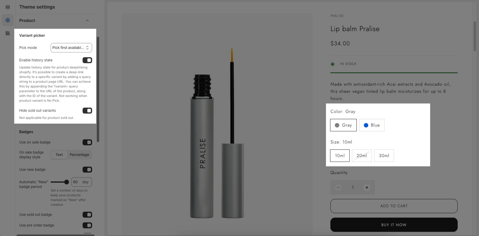 Pick Mode: Select the method of selecting the displayed product variants, can be no pick, pick first variant or pick first available variant