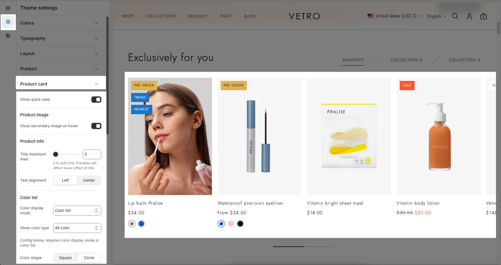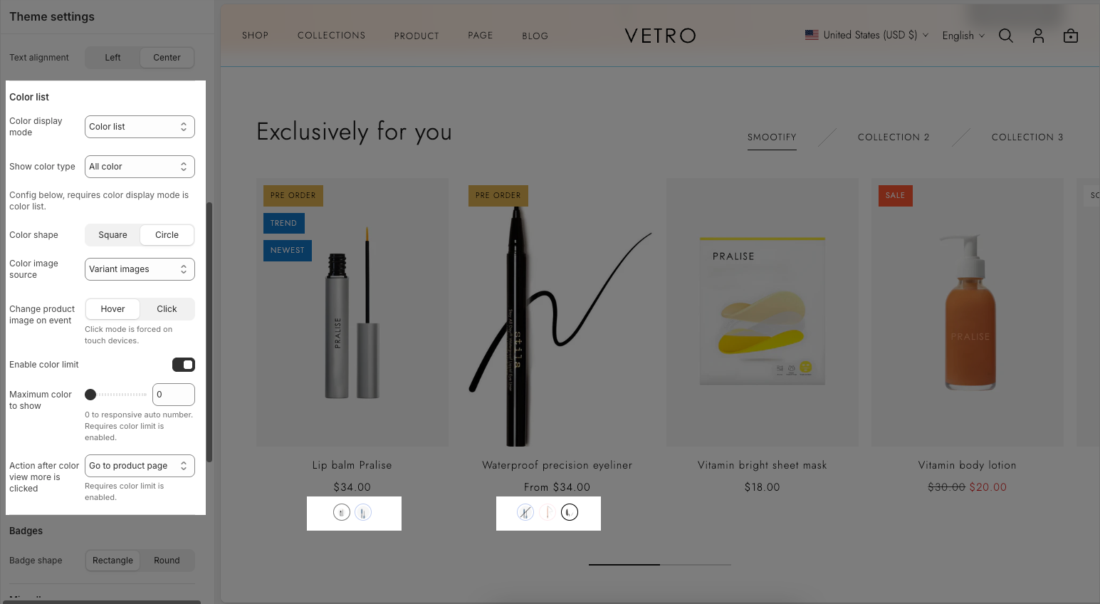 Color shape: Select the shape of the color swatches or image swatches, includes: Square vĂ Circle