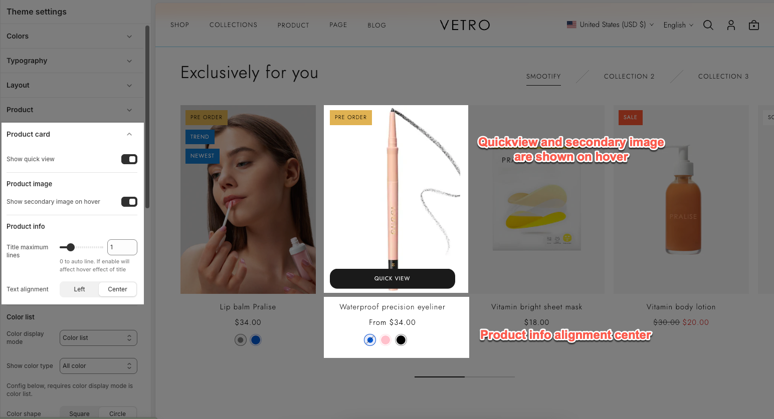 Show secondary image on hover: Toggle that, when enabled, displays a second image of the product when the user hovers their mouse over the product image.