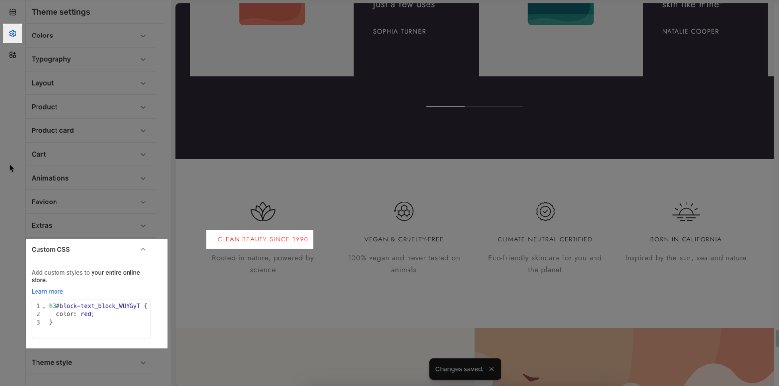 A cascading style sheet (CSS) changes how elements are displayed in your theme, and can control the appearance of several pages at one time. You can customize your theme beyond the settings that are built into a theme by using the custom CSS feature. You can add custom CSS to your entire theme, or to a specific section of a template or devices within your theme.