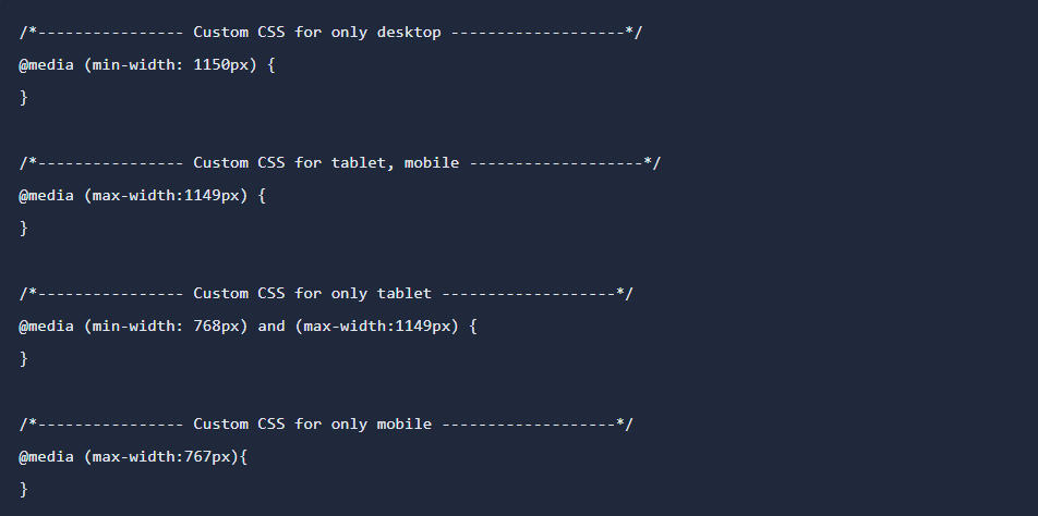 For example: You want custom css to show only on the Desktop, you will add code in the responsive code for only Desktop.