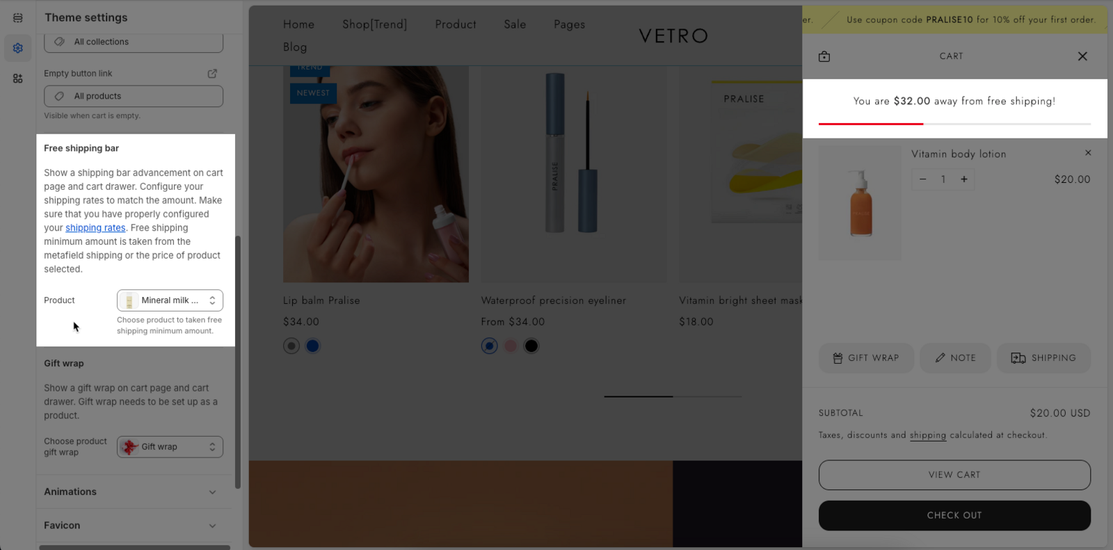 Show a shipping bar advancement on cart page and cart drawer. Configure your shipping rates to match the amount. Make sure that you have properly configured your shipping rates. Free shipping minimum amount is taken from the metafield shipping or the price of product selected.