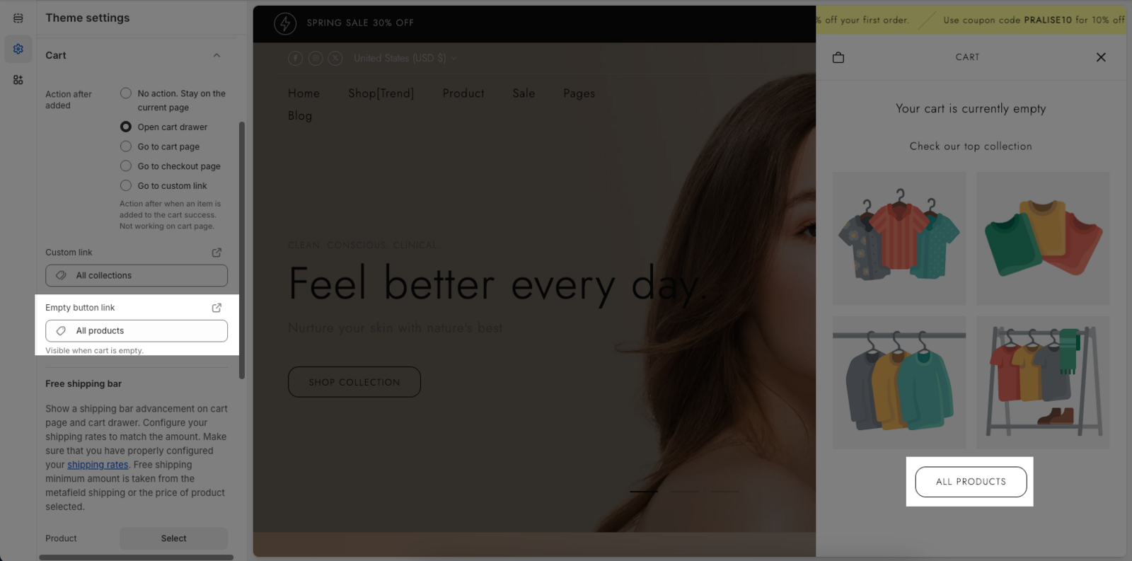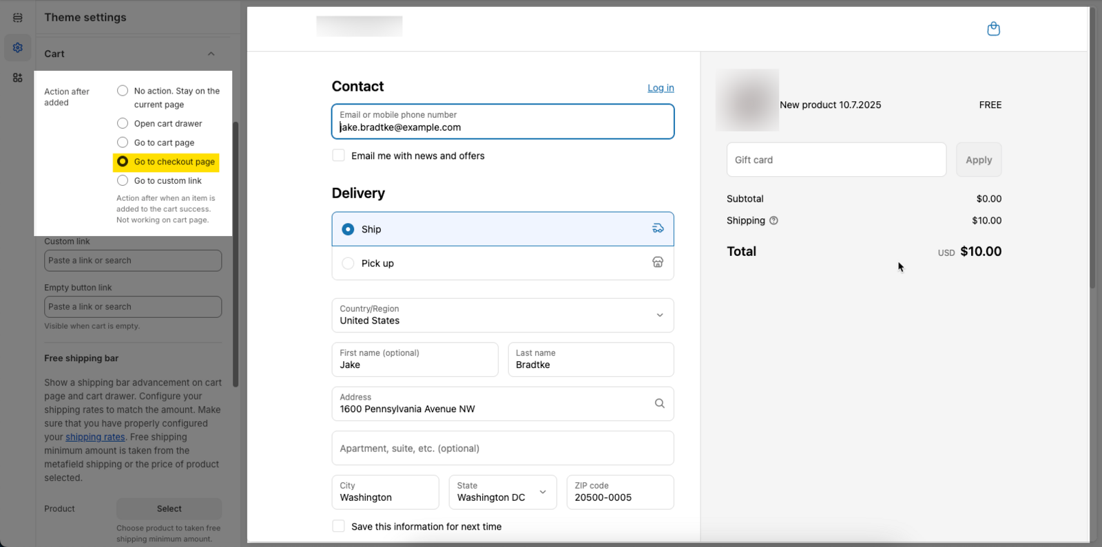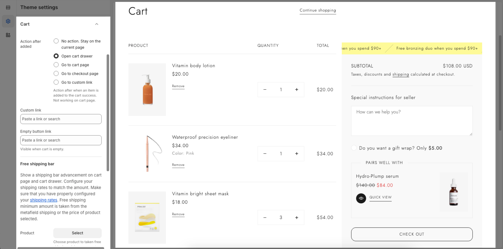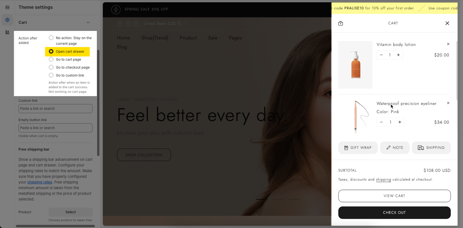 With Cart settings, you can set Action after added to cart, free shipping minimum amount, and gift wrap.