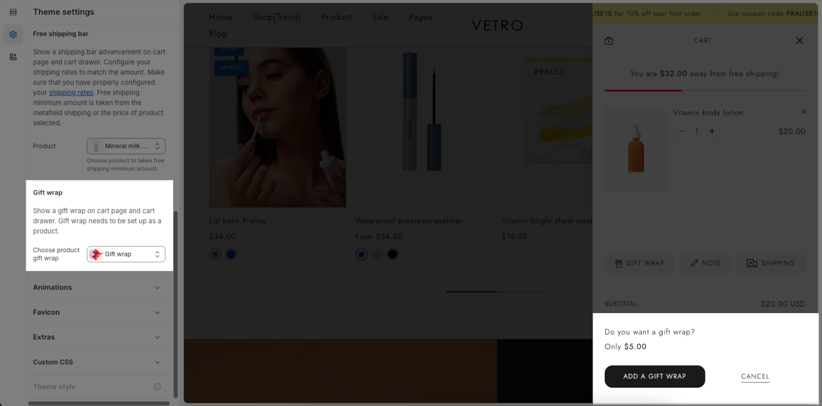 Show a gift wrap on cart page and cart drawer. Gift wrap needs to be set up as a product.