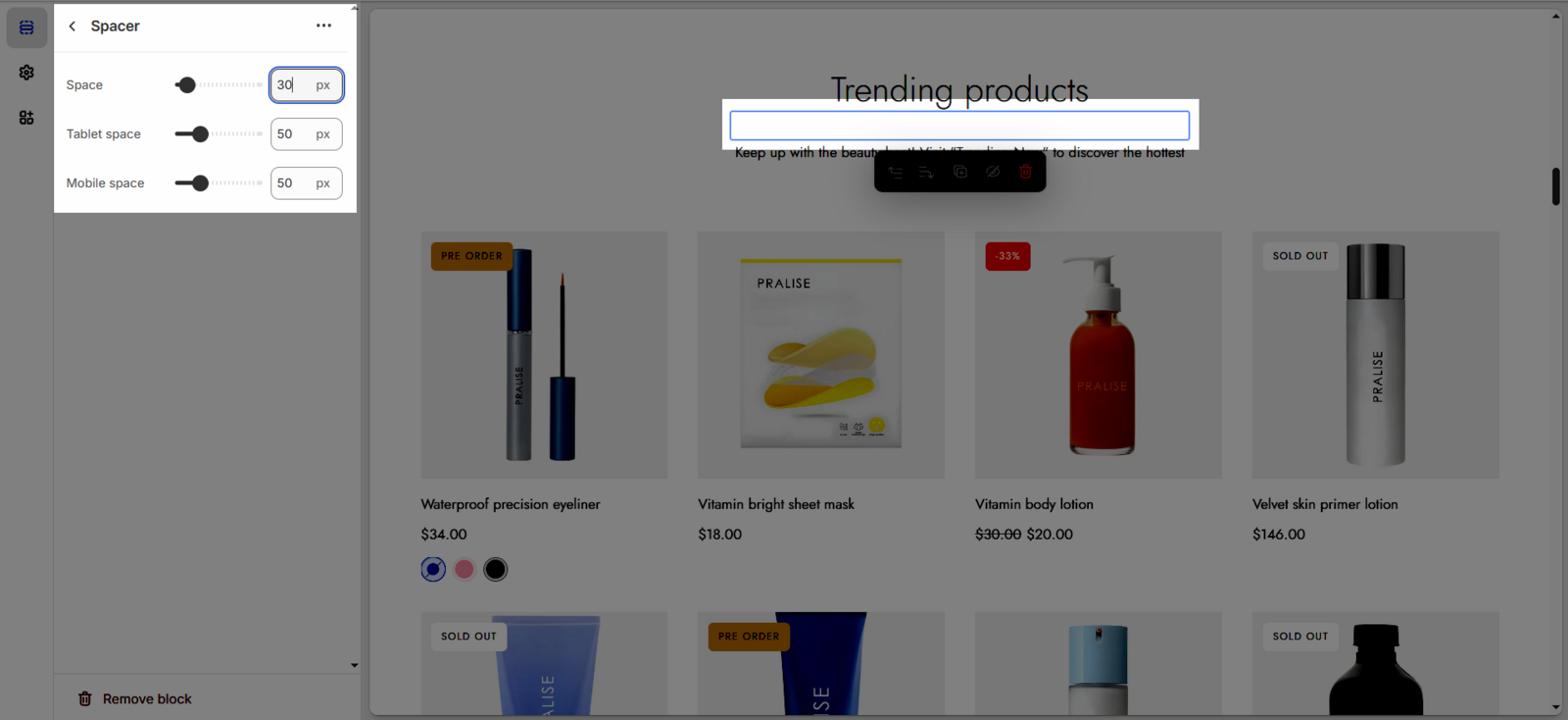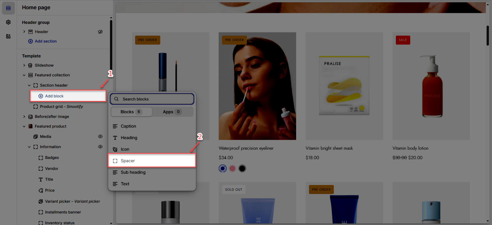 To add Spacer block, click the Add item button (plus icon ➕) under the Section header or any Section of section that has this block (such as: Featured collection section)