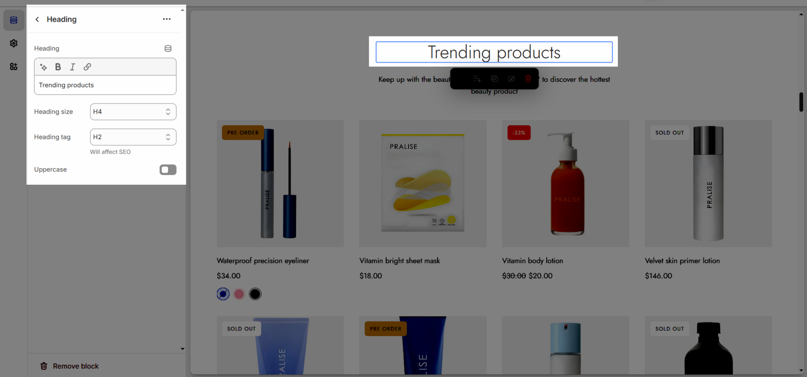Using Heading block helps you structure your website content in a clear and professional way. Properly hierarchical headings (H1, H2, H3...) not only improve readability and navigation for customers but also help search engines better understand the content of your products and pages, thereby supporting effective SEO.