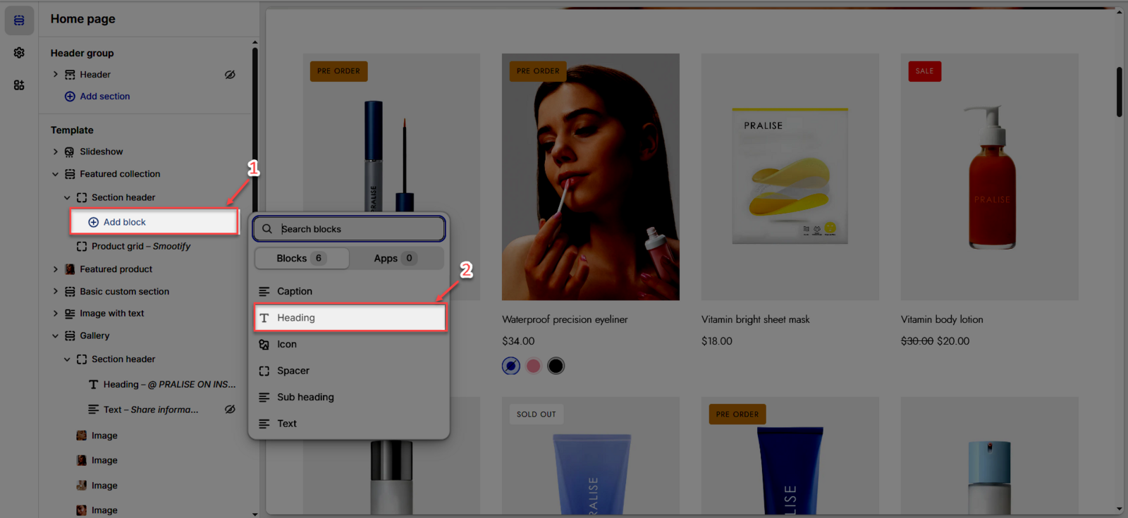 To add Heading block, click the Add item button (plus icon ➕) under the Section header or any Section of section that has this block (such as: Featured collection section)