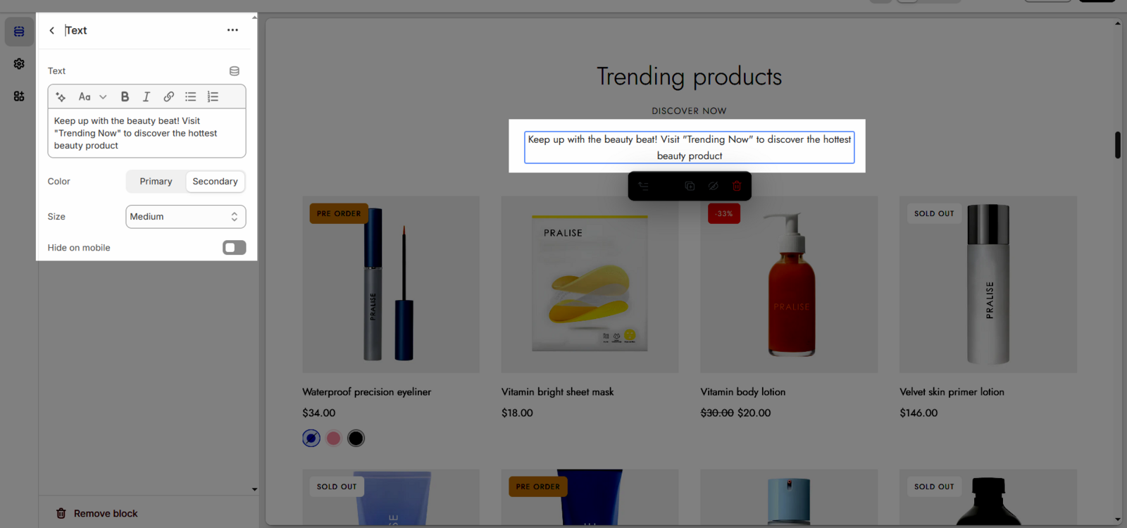 The Text block is where you share product information, describe details, tell your brand story, and engage with customers through language. Clear and engaging text is key to attracting and convincing buyers.