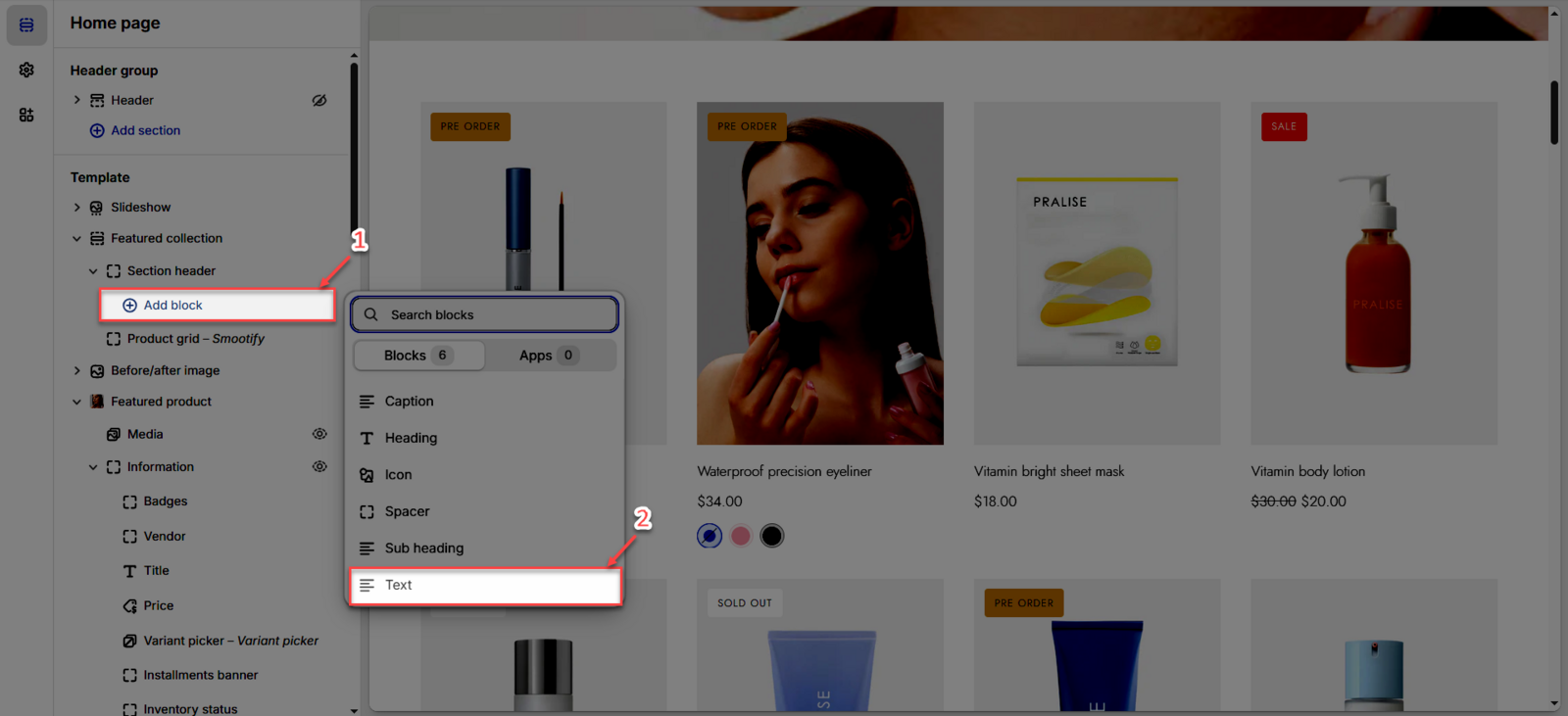 To add Text block, click the Add item button (plus icon ➕) under the Section header or any Sectionof section that has this block (such as: Featured collection section)