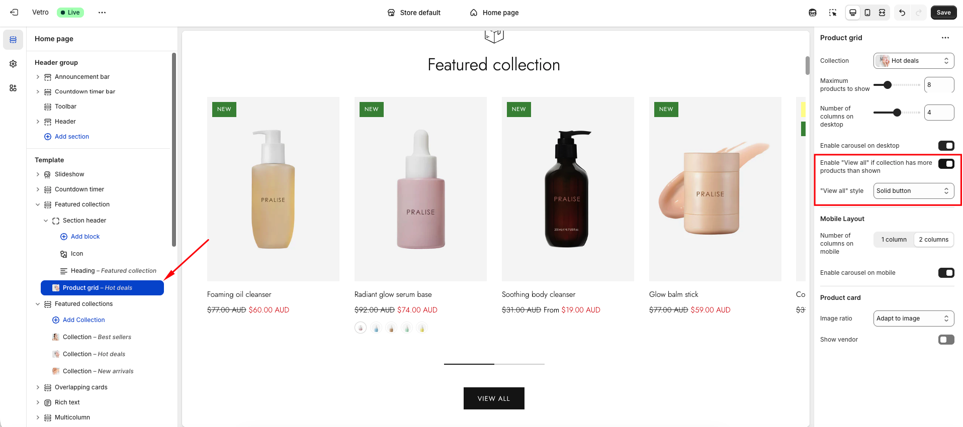 If you want to show only a limited number of products and include a button that links to the full collection page, enable the option Enable "