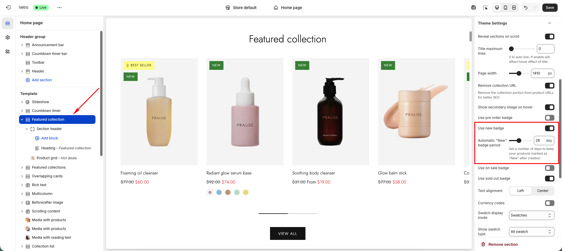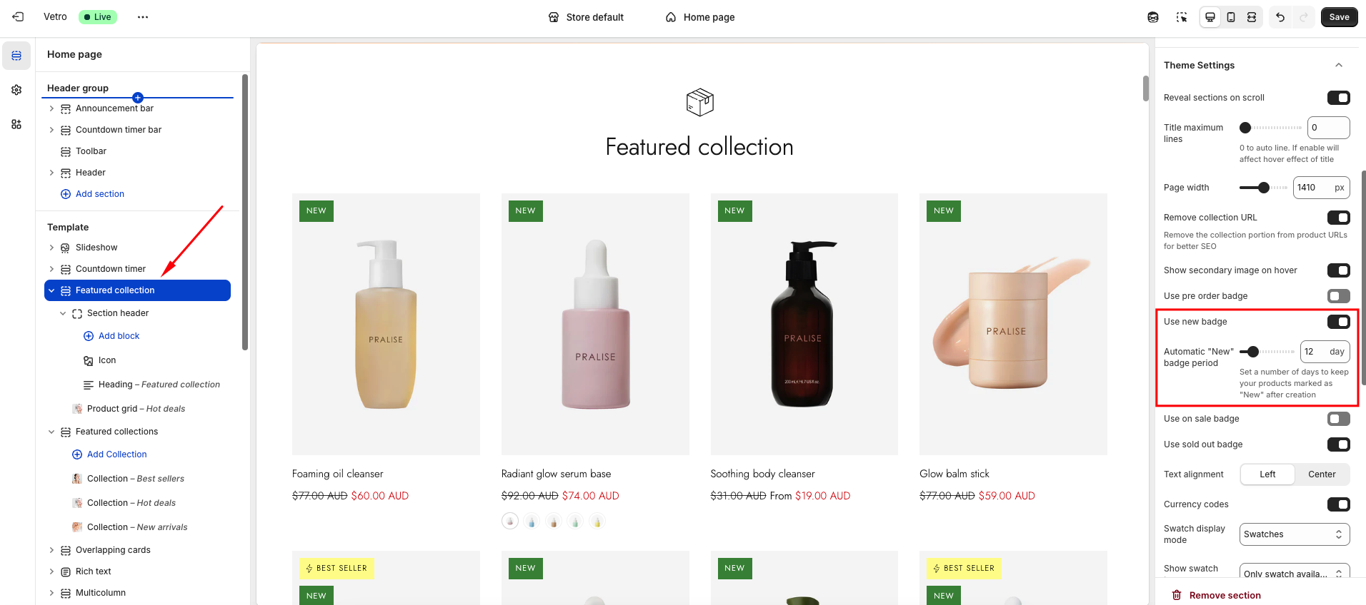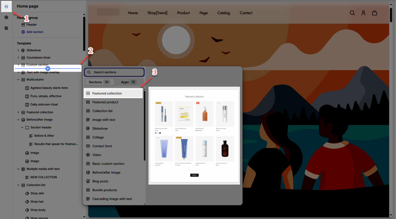 The Featured Collections section is a great way to highlight what matters most in your store — best sellers, new arrivals, or products on sale. It’s highly customizable, so you can design an eye-catching product display that helps customers quickly spot items they’ll love and enjoy a smoother, more pleasant shopping experience.