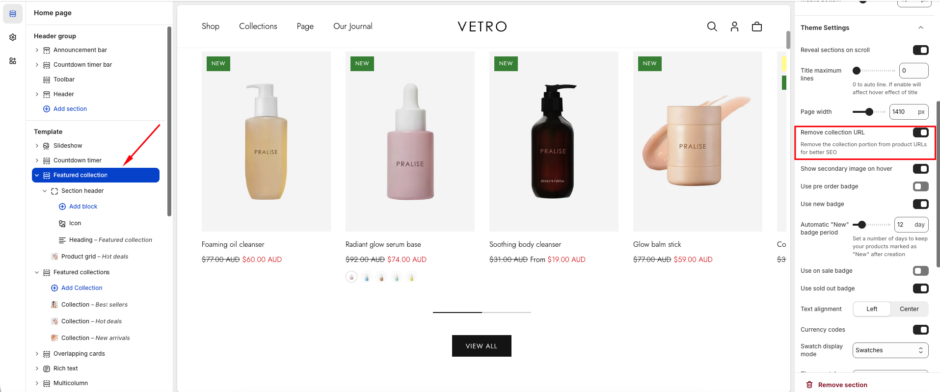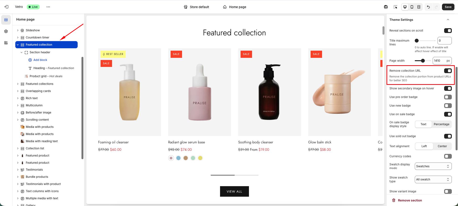 If you want to remove the /collection Part from product URLs to improve SEO, go to Theme settings and turn on the option Remove collection URL. Once enabled, product URLs will be cleaner and no longer include the collection path.