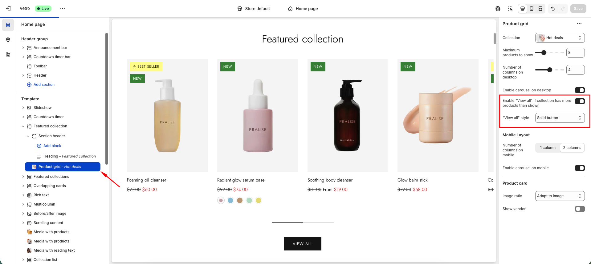 If you want to show only a limited number of products and include a button that links to the full collection page, enable the option: Enable "View all" if the collection has more products than shown. The button will appear automatically.