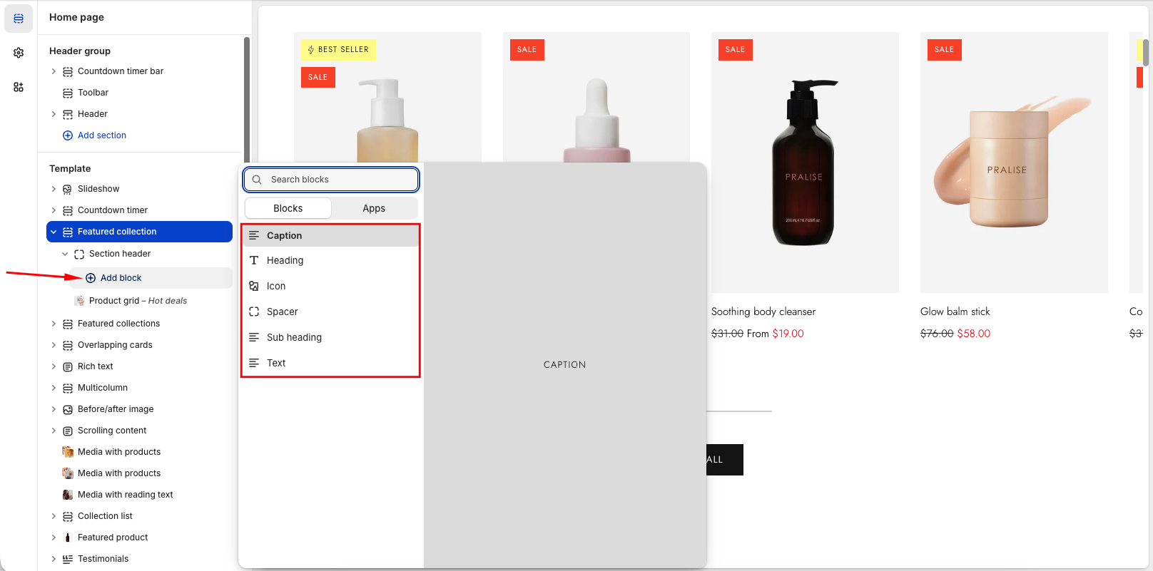 You can add 6 types of blocks to the Section header in the Featured Collection section: