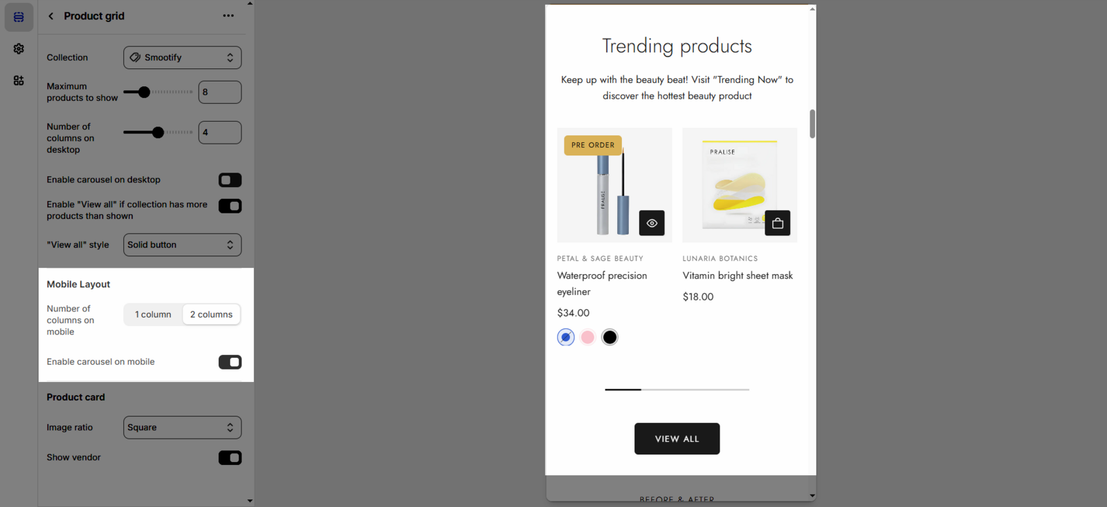 Number of columns on mobile: Choose how many product columns to show on mobile (1 or 2 columns).