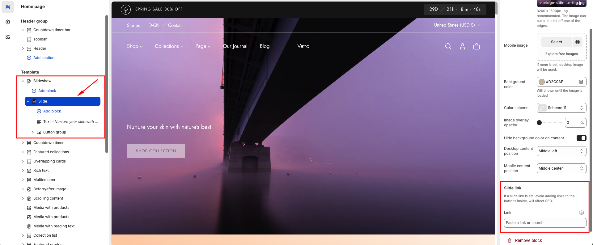 Note: If a slide link is set, avoid adding buttons inside the slide to prevent SEO.