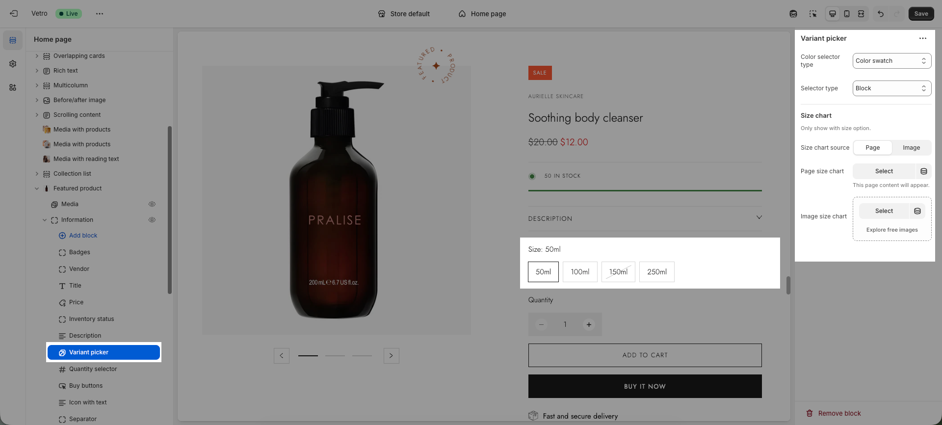 Within the Variant Picker, you can also configure a Size Chart. The size chart can be displayed using one of the following sources: An image or a page.