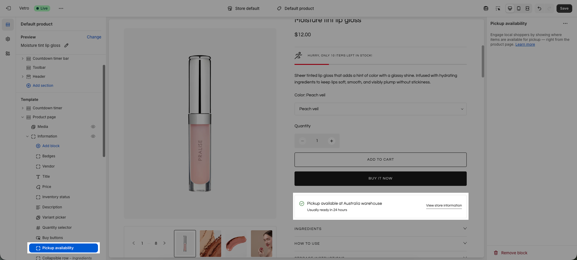 To display pickup availability, you need to configure in-store pickup in your Shopify admin.