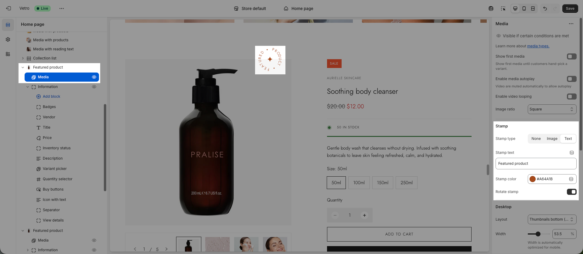 In the Media block, you’ll find the Stamp option. This option allows you to add a rotating circle in the top-right corner of the media. The stamp can display either text or an image.