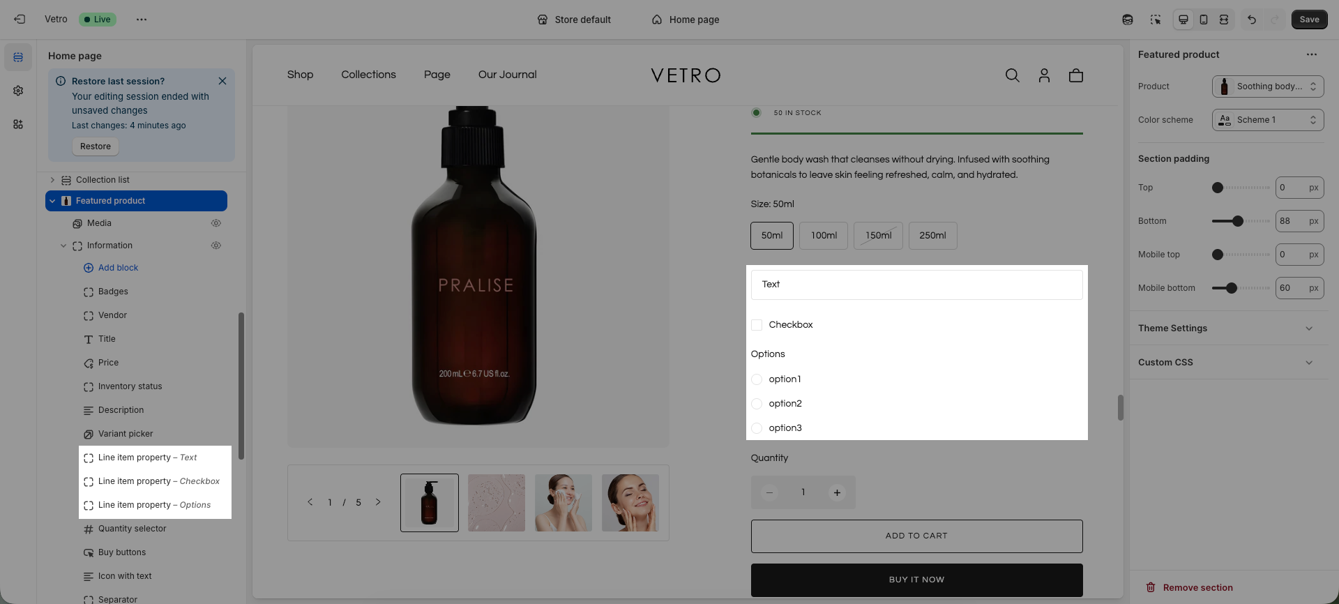 Line item properties are used to collect customization information when a product is added to the cart.