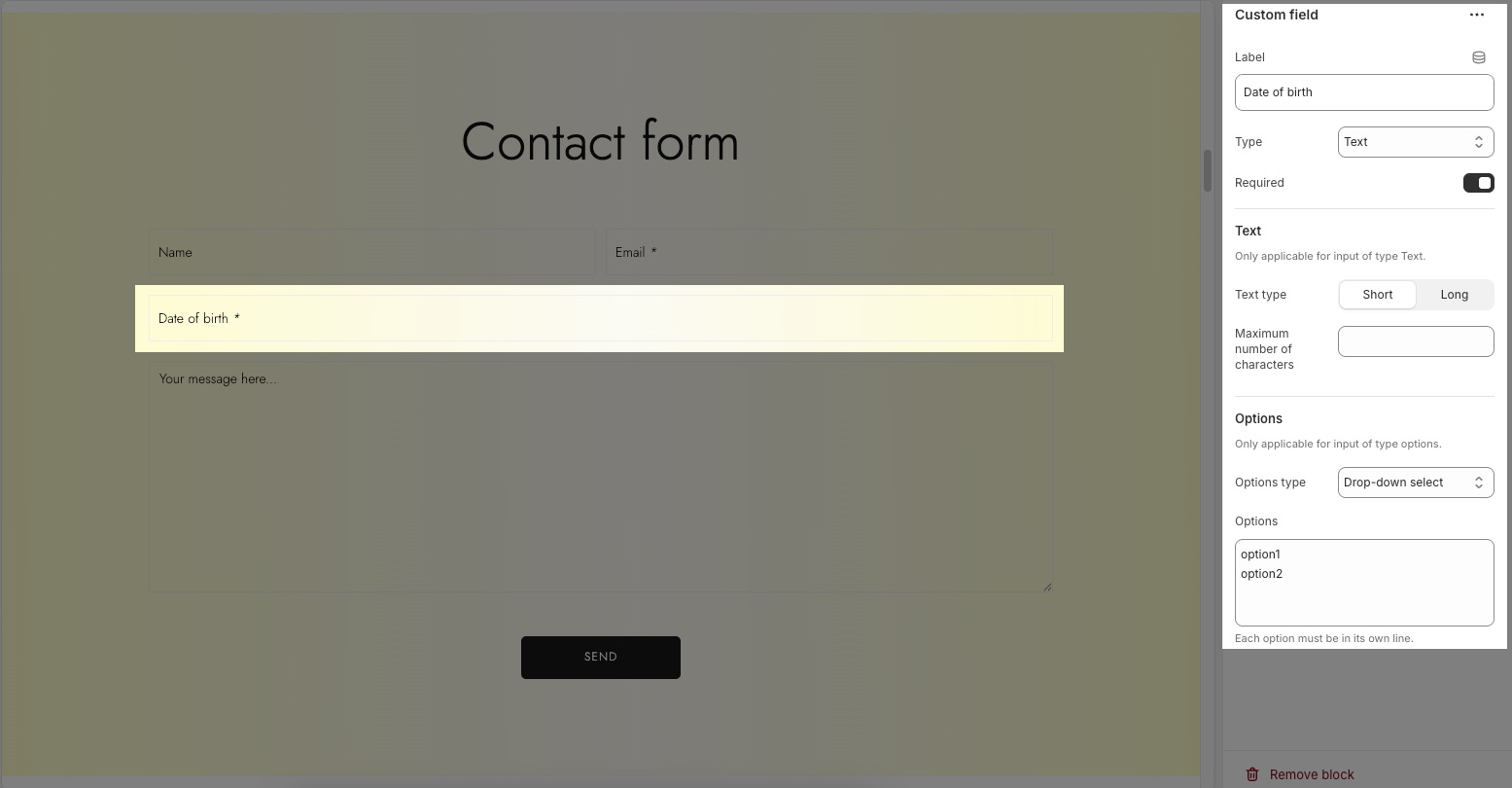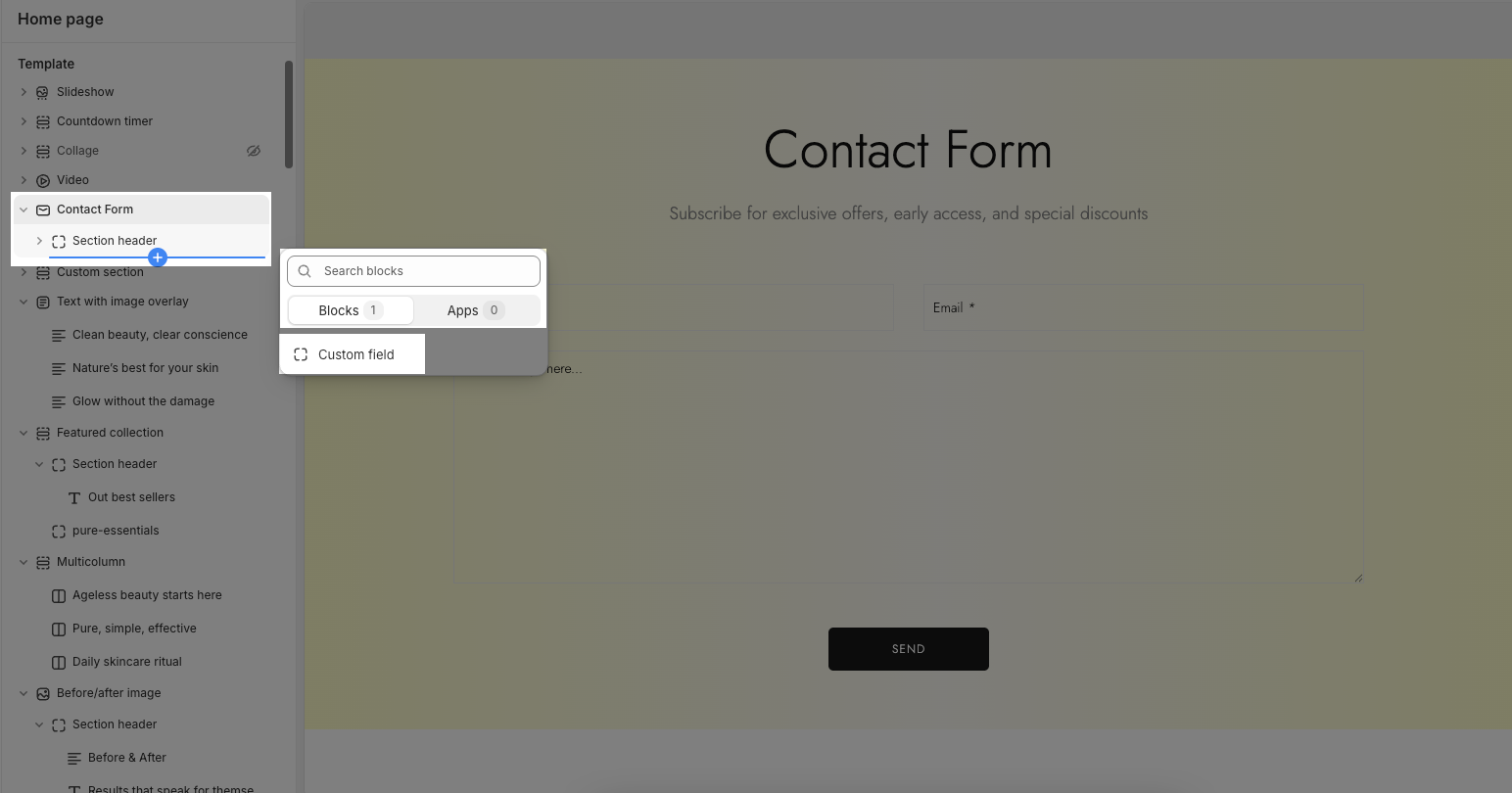 To add a Custom field block, click the Add block button (plus icon ➕) under the Contact Form section > In the Blocks tab, select Custom field.