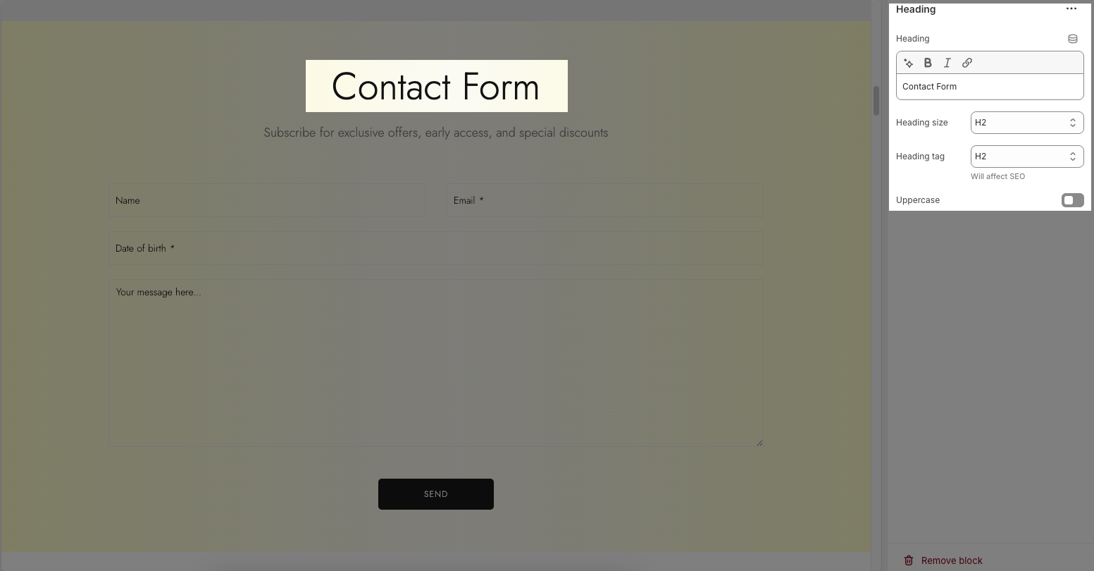 Uppercase: Toggle this on to automatically convert the heading to ALL UPPERCASE letters. When off, the heading appears as typed.
