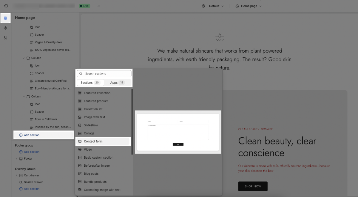 Step 02: In the theme editor (Customize), click the Sections button > Click the Add section button > In the Sections tab, scroll through the list or use the search bar to find and select Contact Form.