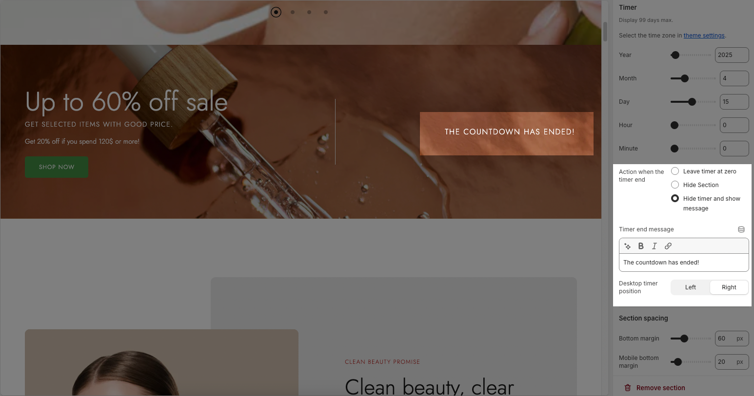 Desktop timer position: Select whether the countdown timer appears on the Left or Right side of the section.