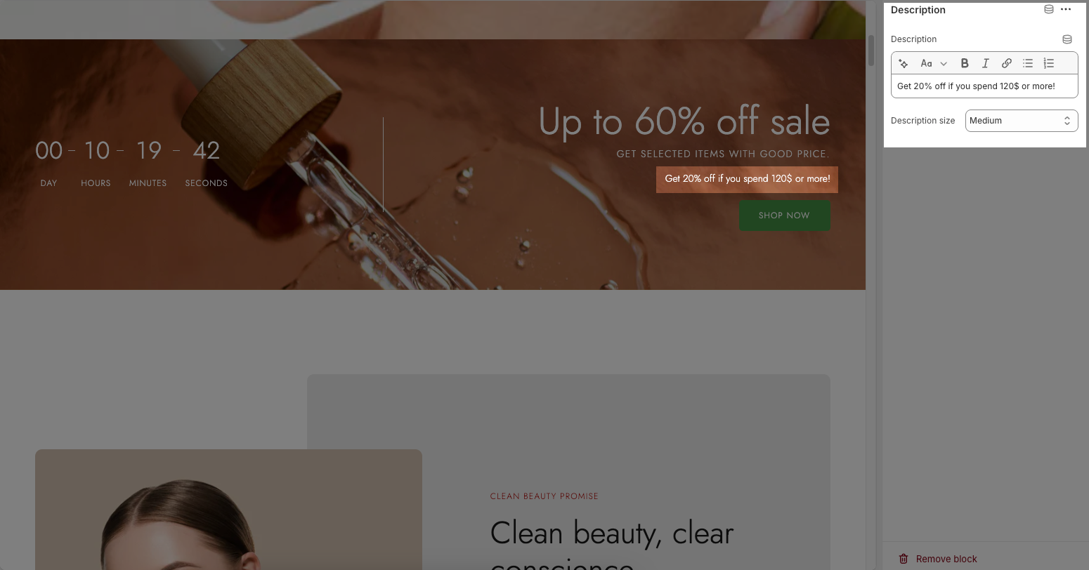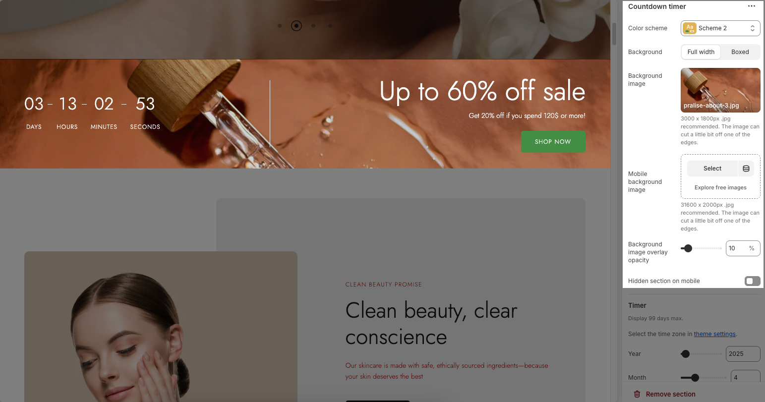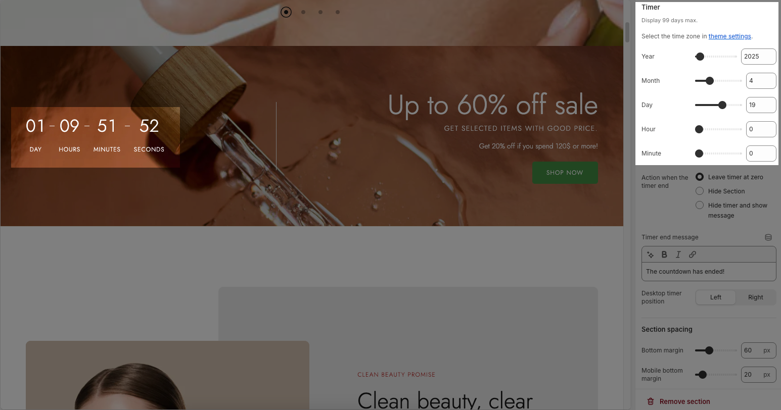 Display period: The countdown timer can run for up to 99 days maximum. You can set the time zone in the theme settings to ensure the countdown ends at the correct local time.