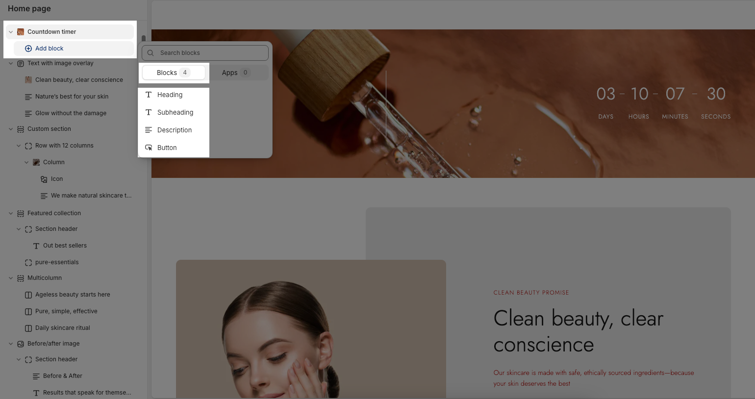 To add those blocks, click the Add block button (plus icon ➕) under the Countdown timer section > Then, in the Blocks tab, select the block you want to add.