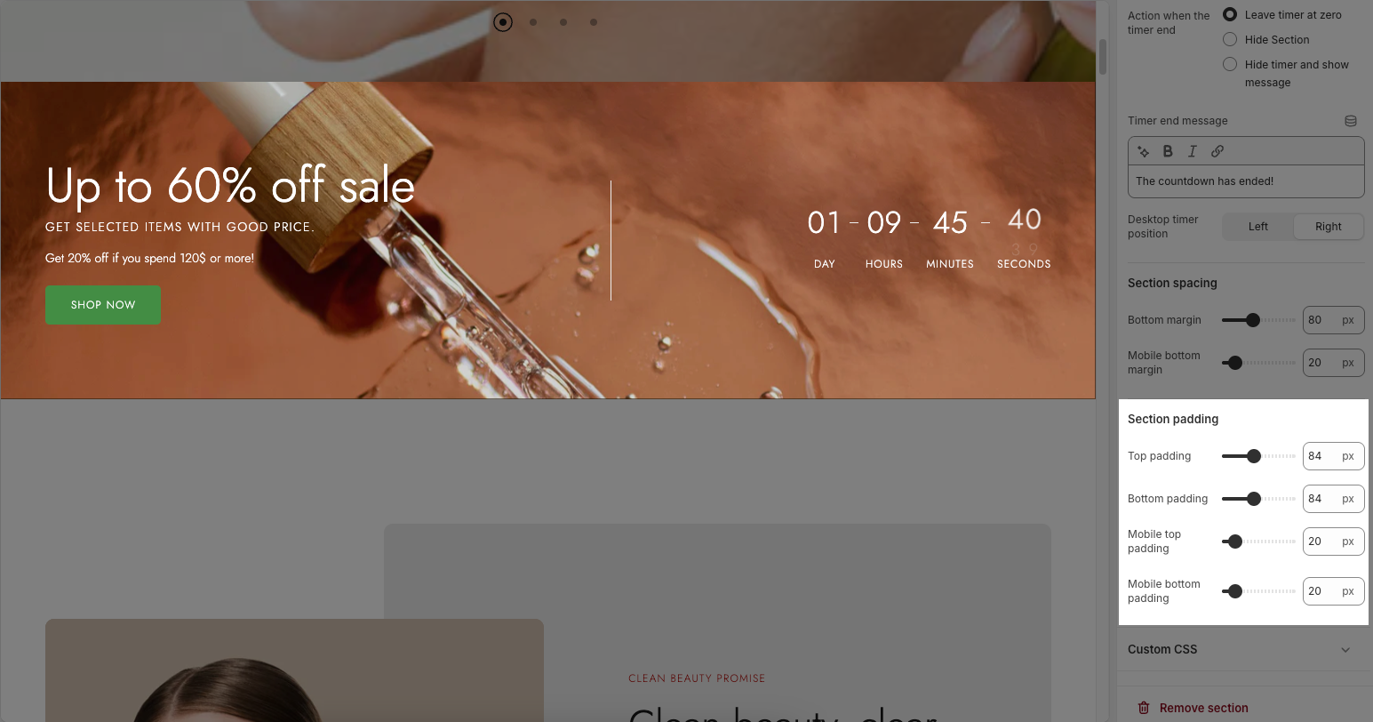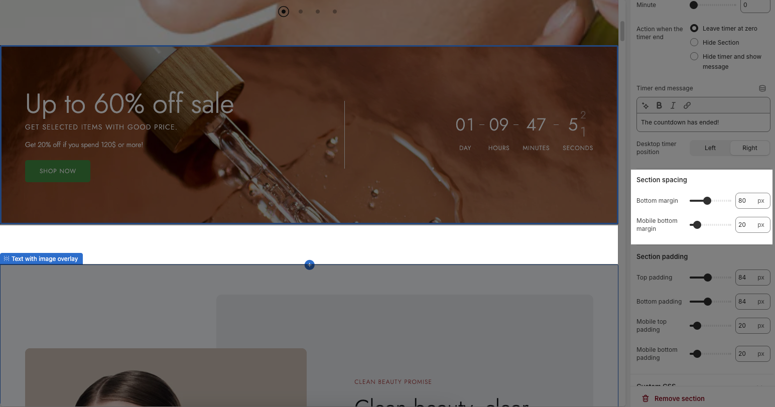 Bottom margin: Controls the amount of space (in pixels) below the Countdown timer section on desktop devices.