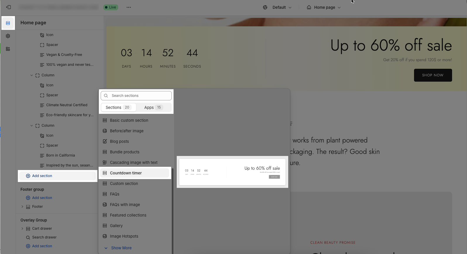 Step 02: In the theme editor (Customize), click the Sections button > Click the Add section button > In the Sections tab, scroll through the list or use the search bar to find and select Countdown timer.