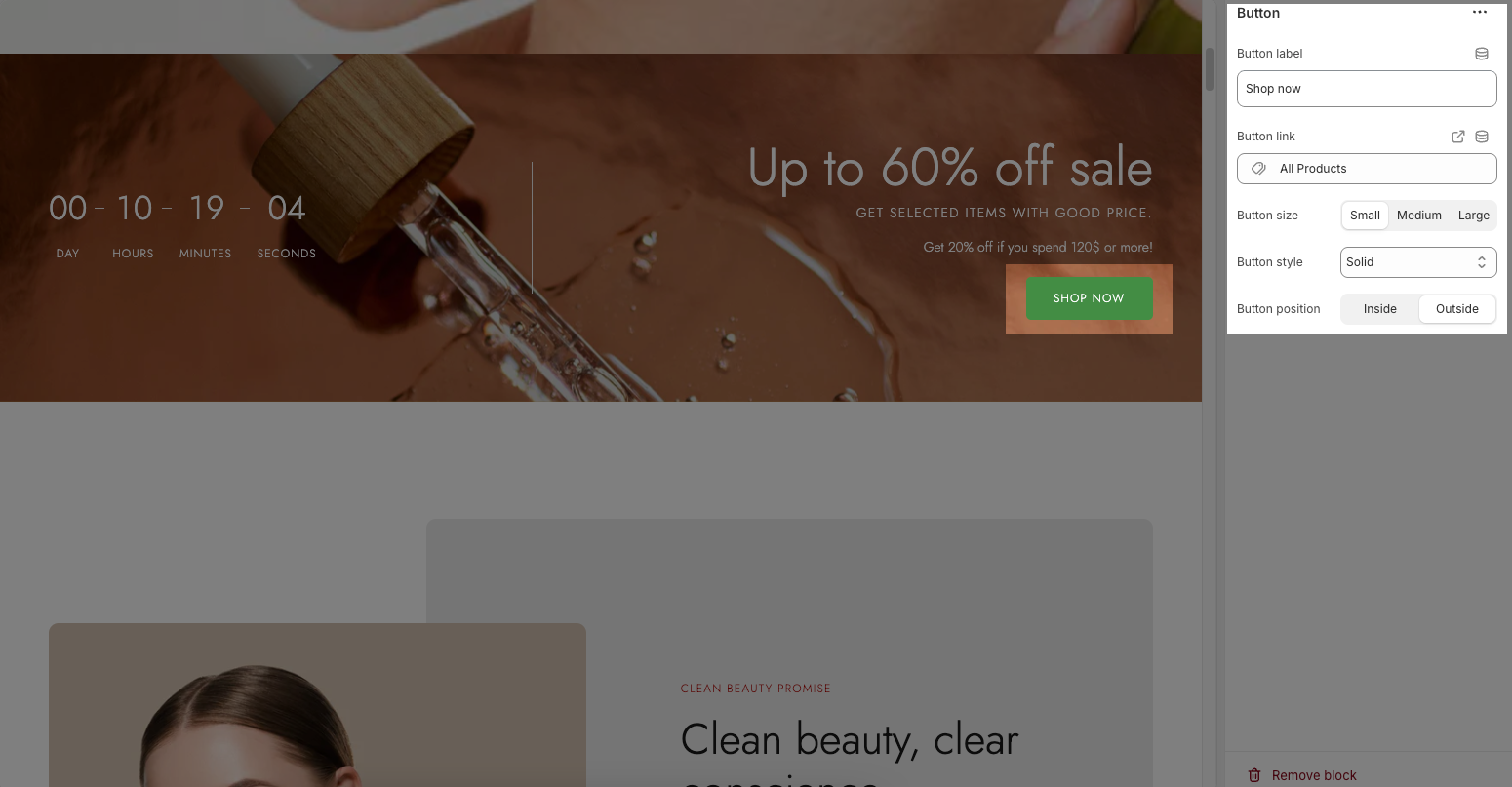 Button link: Enter the URL or select a page/product to link the button to. When clicked, users will be directed to the specified destination.