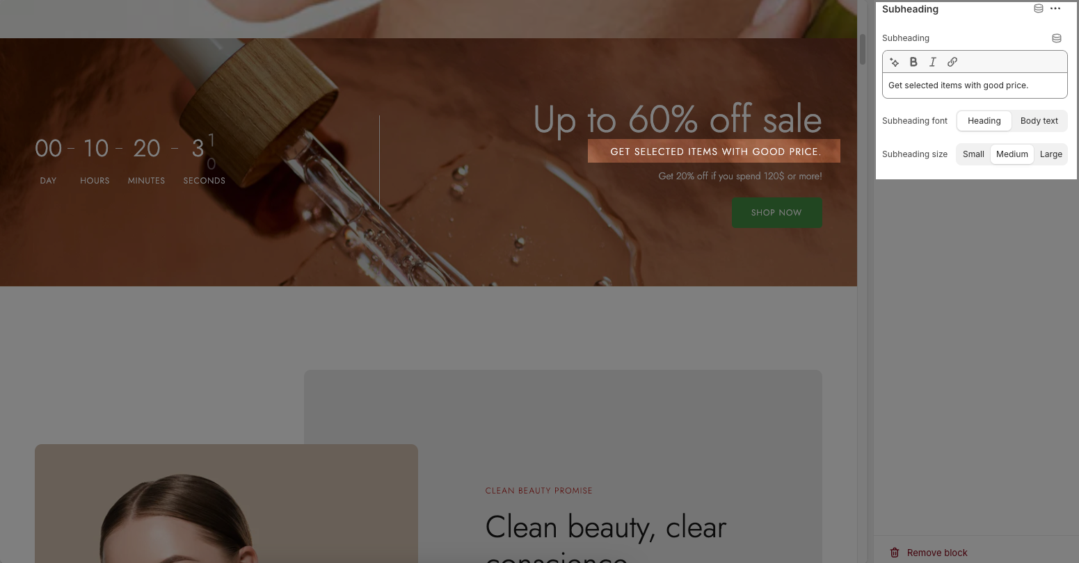 Subheading font: Choose the font style for the subheading, options included: Heading and Body text. You can set the font for Heading and Body text option in the Theme settings > Typography > Heading font, Body font.