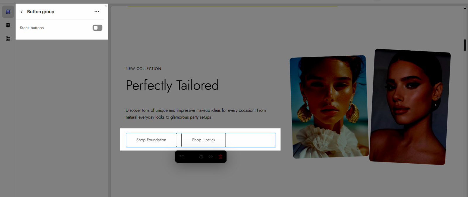 To add Button Group block to the Cascading image with text section, click the Add item button (plus icon ➕) under the Cascading image with text