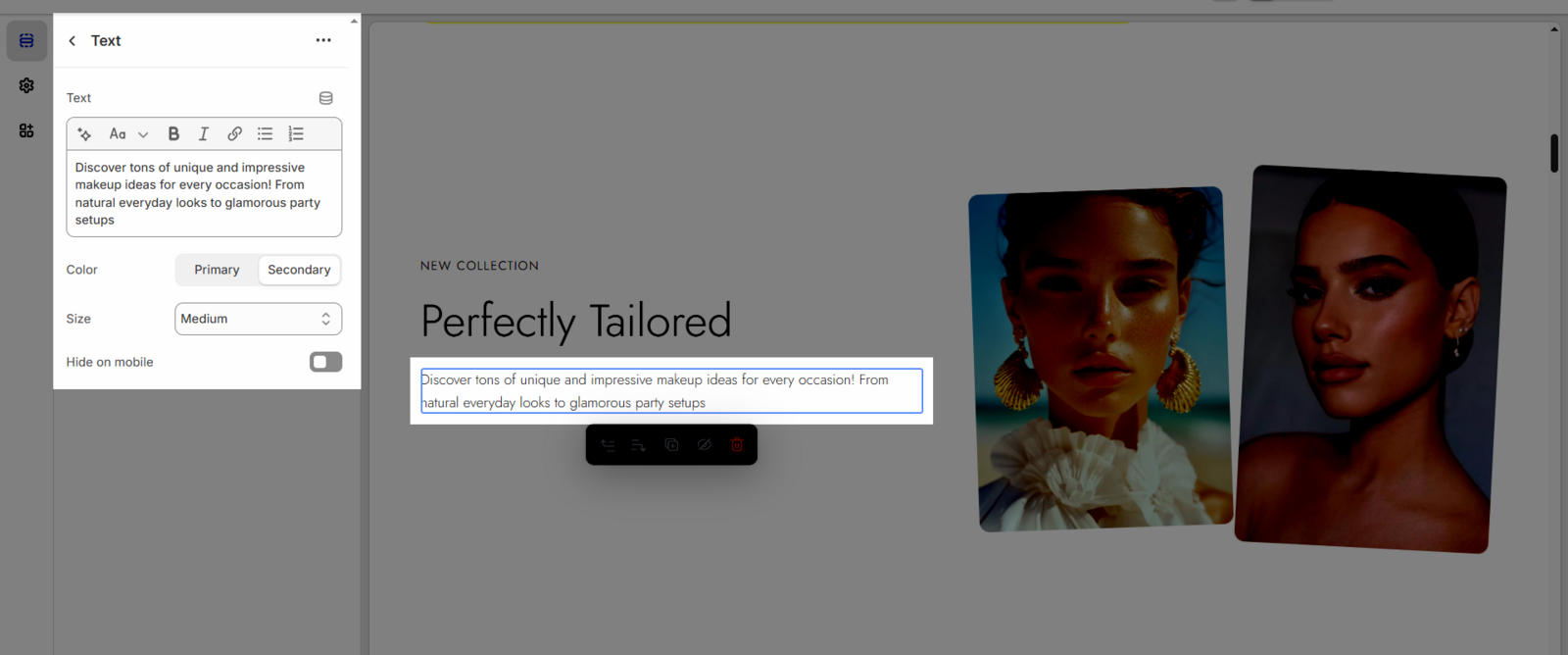 Color: Select the color for the text, distinguishing between primary and secondary colors to match the design