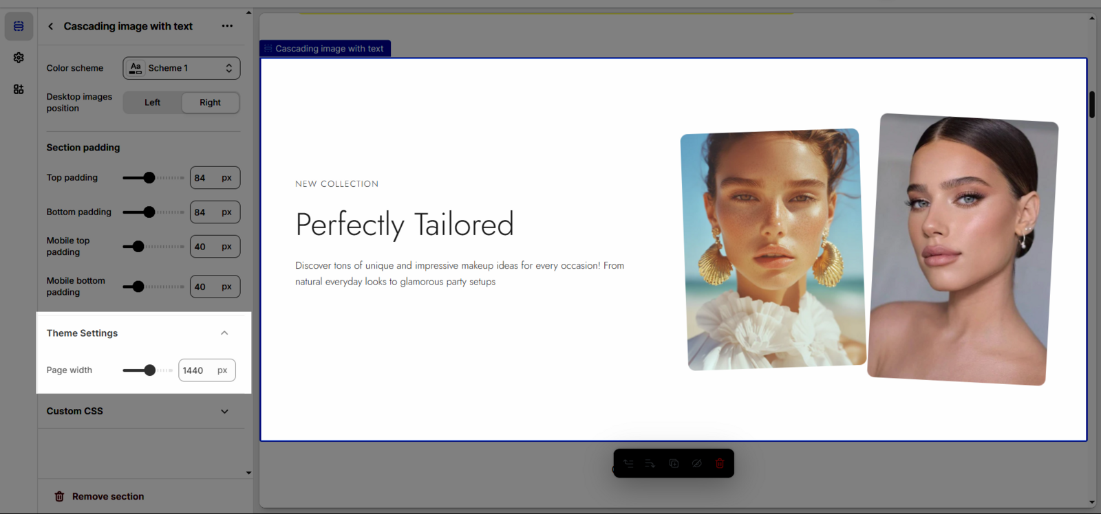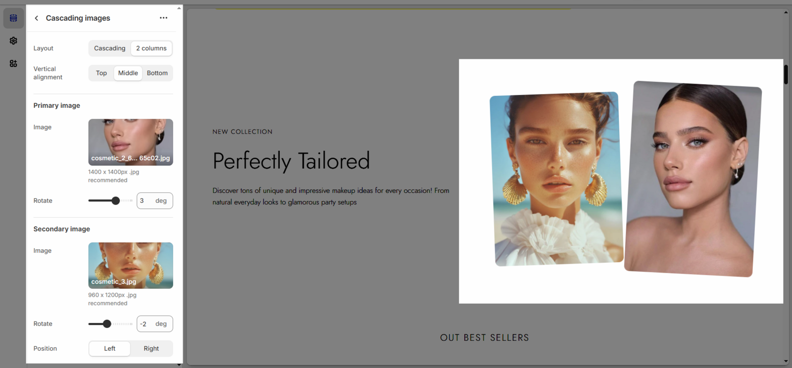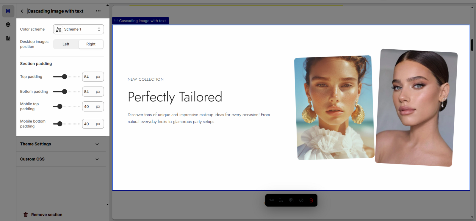 Once you add the Cascading image with text section, you can customize its settings in the left or right sidebar (depending on your screen size)