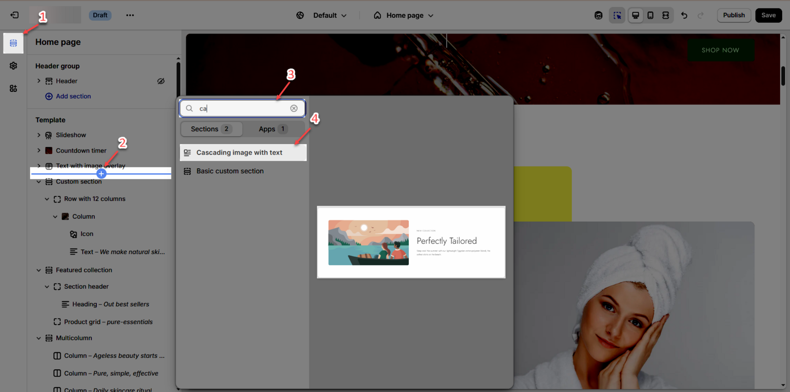Step 02: In the theme editor (Customize), click the Sections button > Click the Add Section button or hover below another section until the (➕) icon appears > In the Sections tab, scroll through the list or use the search bar to find and select Cascading image with text