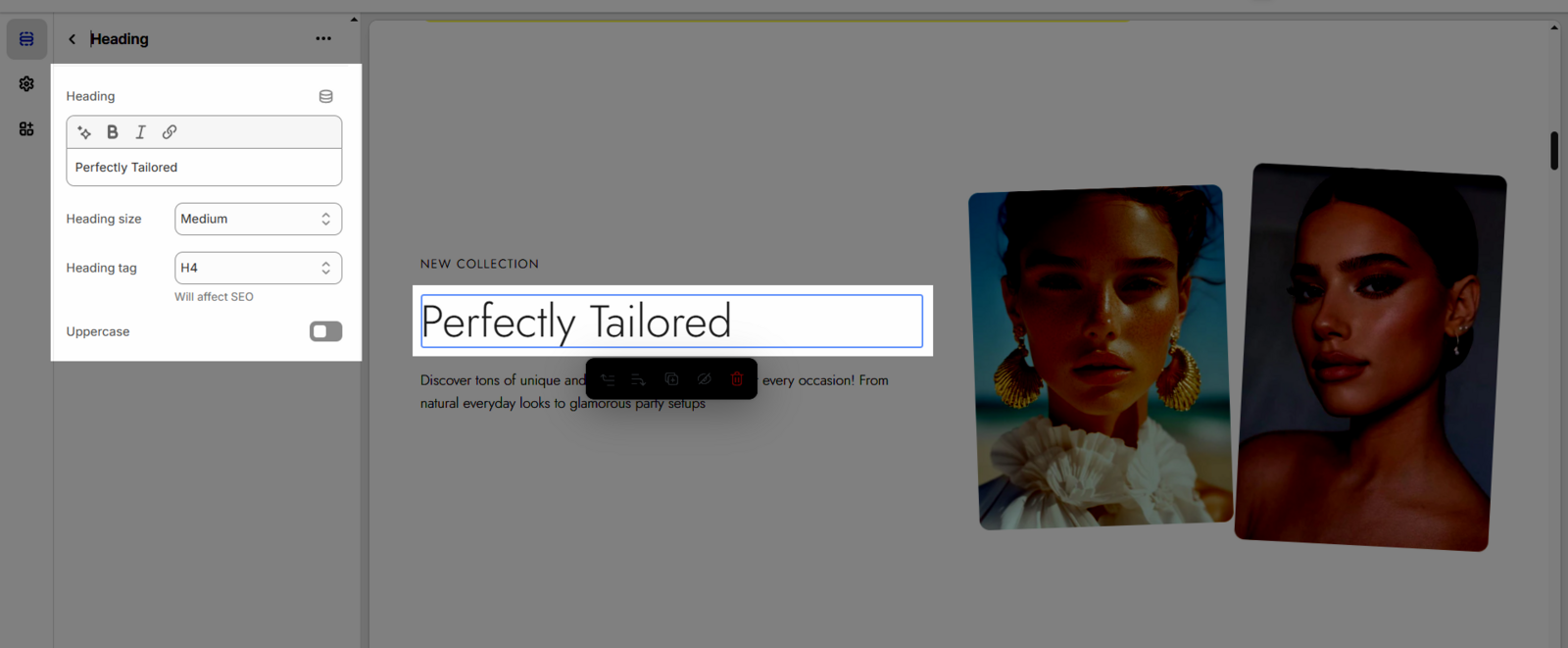 Heading tag (Will affect SEO): Select the HTML tag for the heading (eg: H1, H2, H3), affecting SEO structure and content hierarchy.