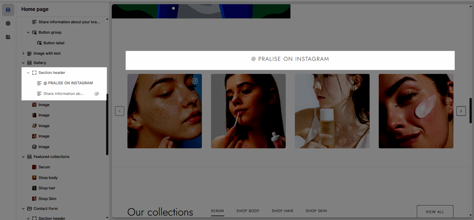 Step 02: In the theme editor ( Customize), click the Sections button > Click the Add Section button or hover below another section until the (➕) icon appears > In the Sections tab, scroll through the list or use the search bar to find and select Gallery