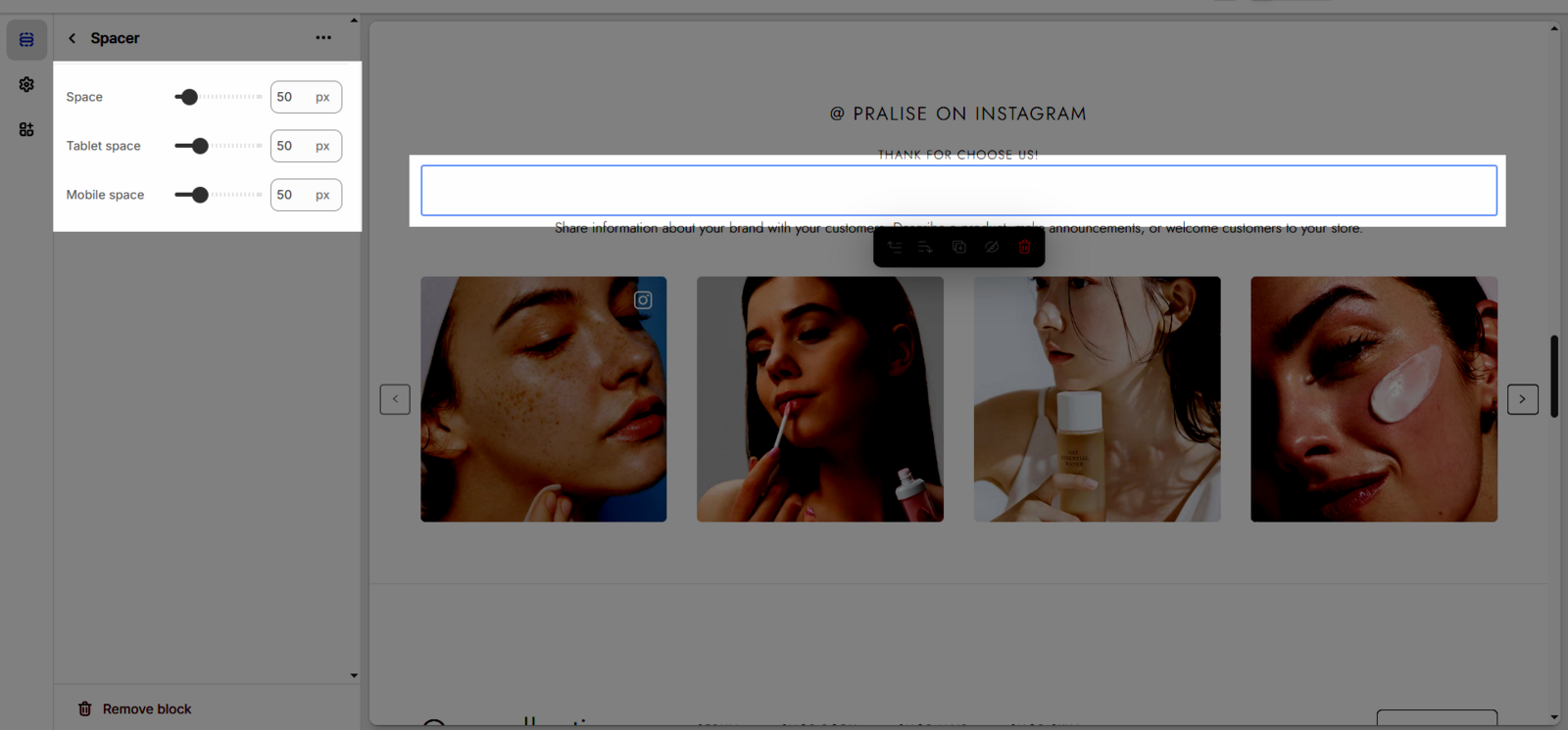 Spacing between images: Adjusts the spacing between images on desktop screens, controlling the layout and creating content clarity.