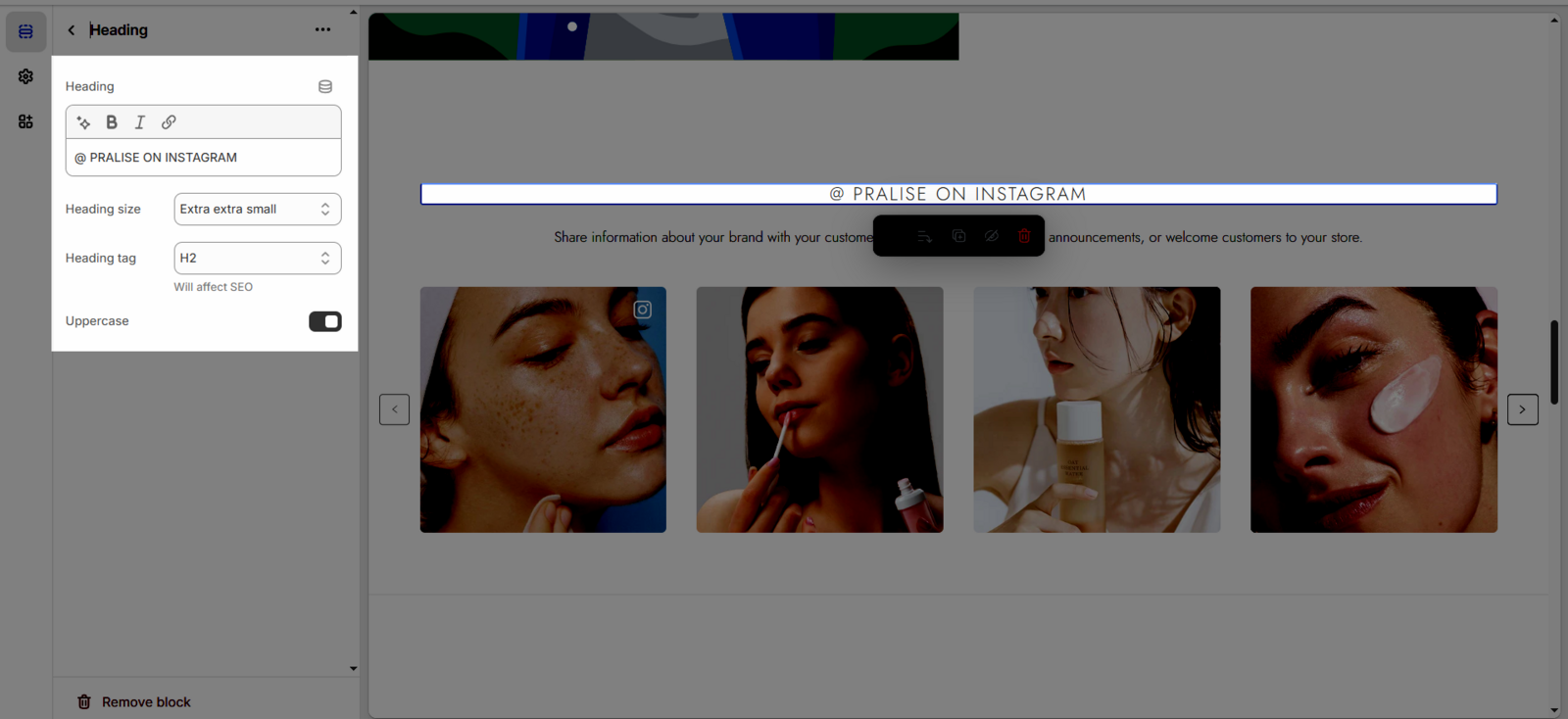 Heading tag (Will affect SEO): Select the HTML tag for the heading (eg: H1, H2, H3), affecting SEO structure and content hierarchy.