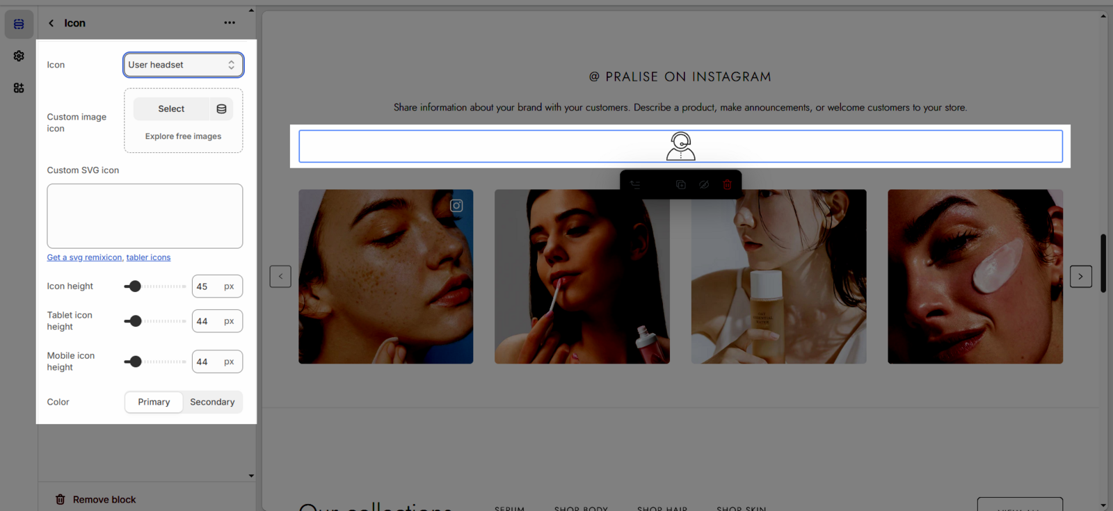 Once the Icon block is added, you can customize its settings in the left or right-hand sidebar (depending on your screen size)