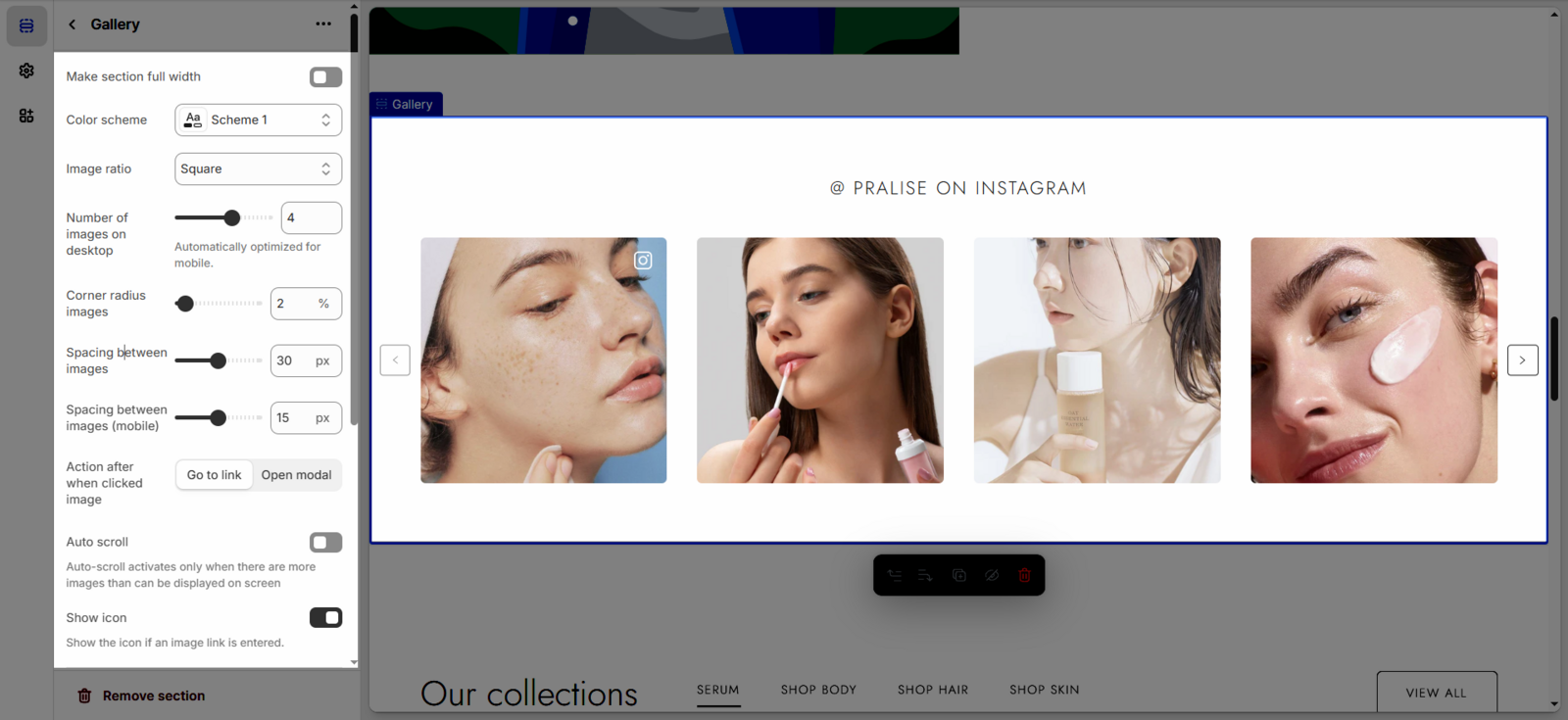Once you add the Gallery section, you can customize its settings in the left or right sidebar (depending on your screen size)