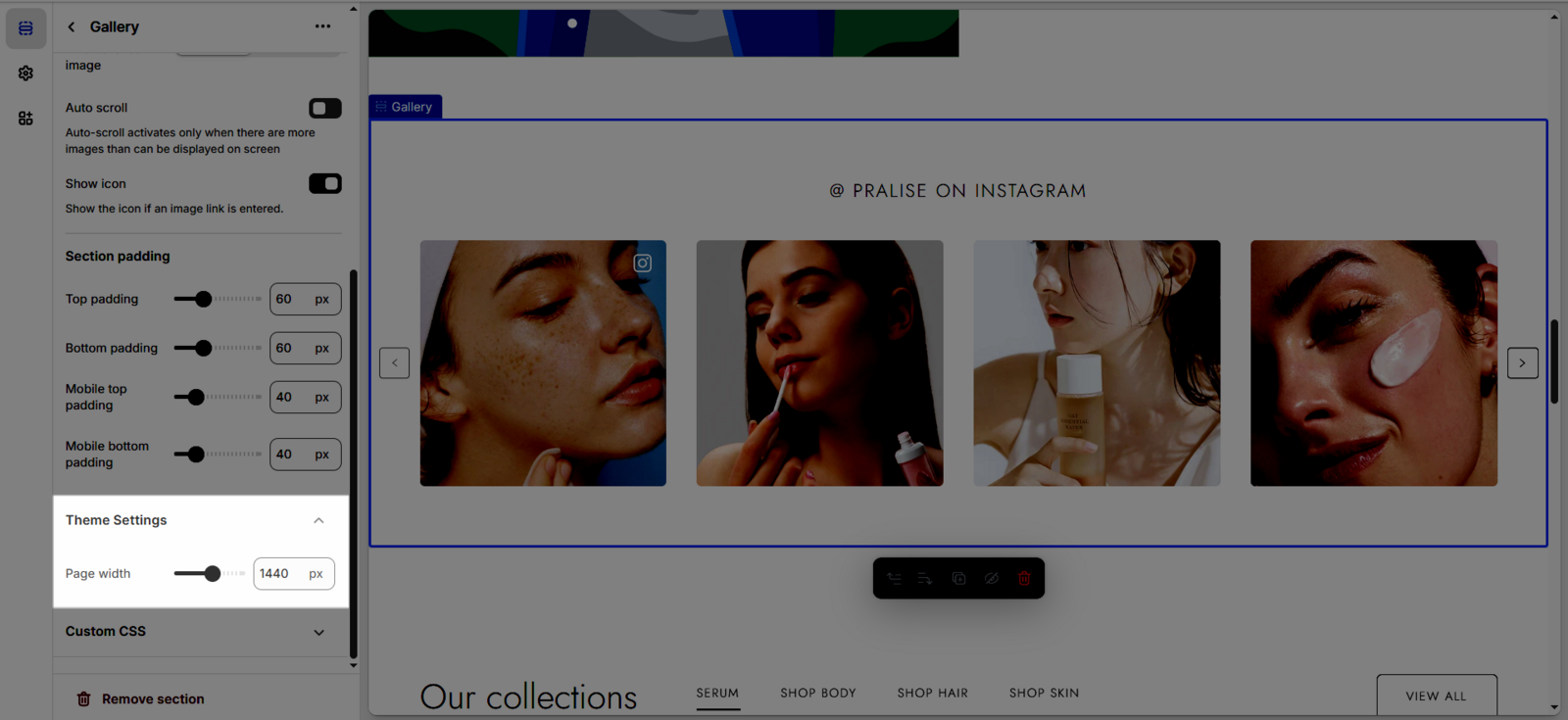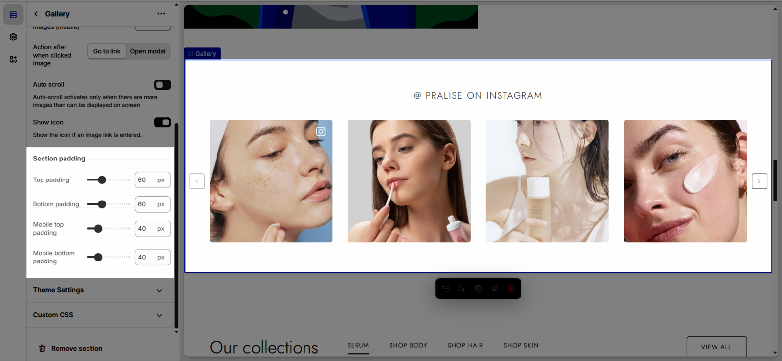 Clicking on the Section header title under Gallery section, you can customize that section's settings in the left or right sidebar (depending on your screen size)